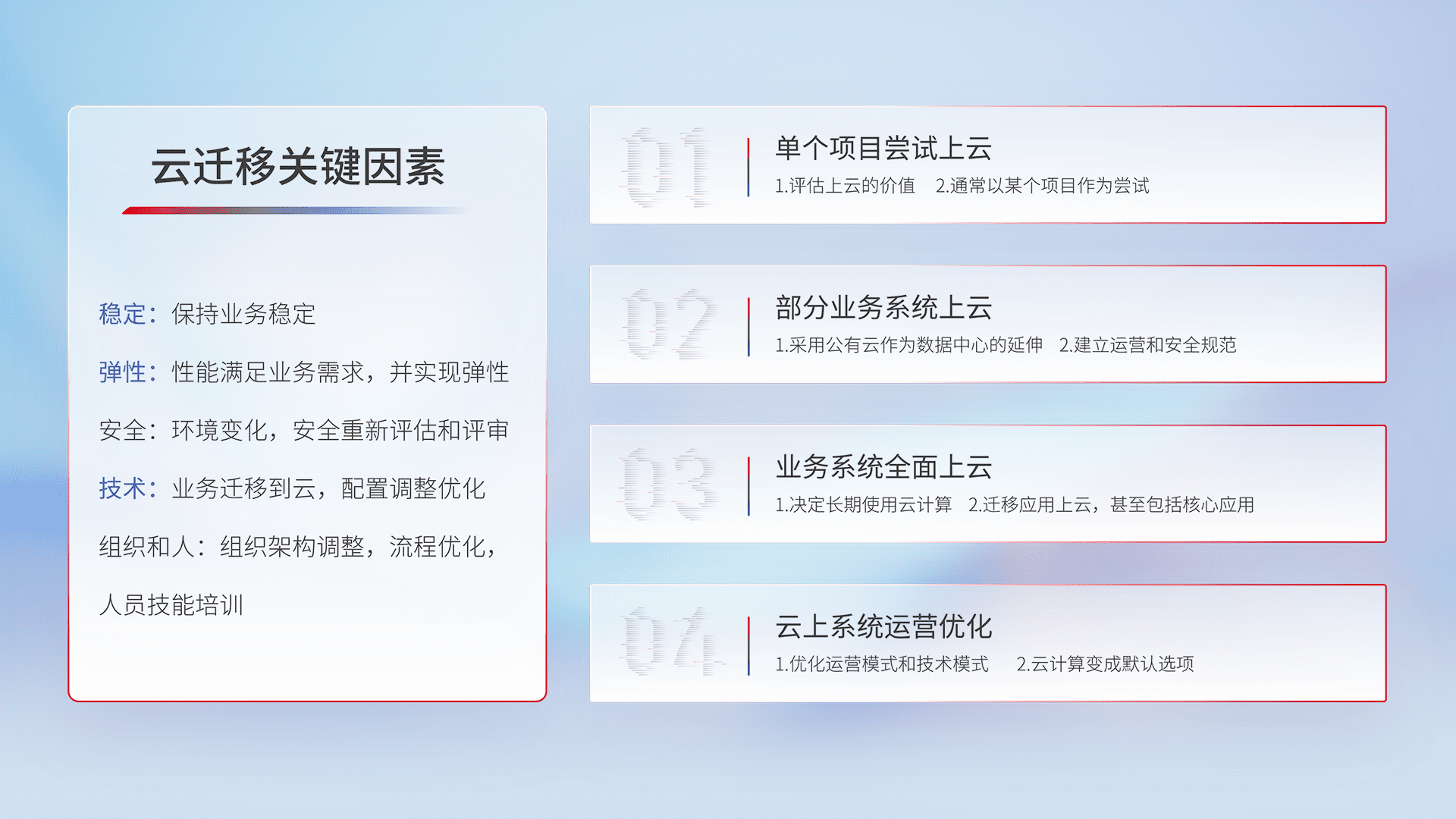 结合实际业务,,,从规划设计、、云平台选型、、、、云原生改造、、、、数据迁移、、集成交付,,迁移全过程为客户识别最佳上云路径,,做好风险识别管理,,,,设计网络架构、、、、身份权限、、、、安全审计合规、、、操作审计、、、、日志审计、、监控告警策略、、、、多站点容灾设计等,,对云上基础设施进行整体规划,,,,提升IT治理水平,,,以满足弹性、、、、高可用、、、、高性能的需求。。