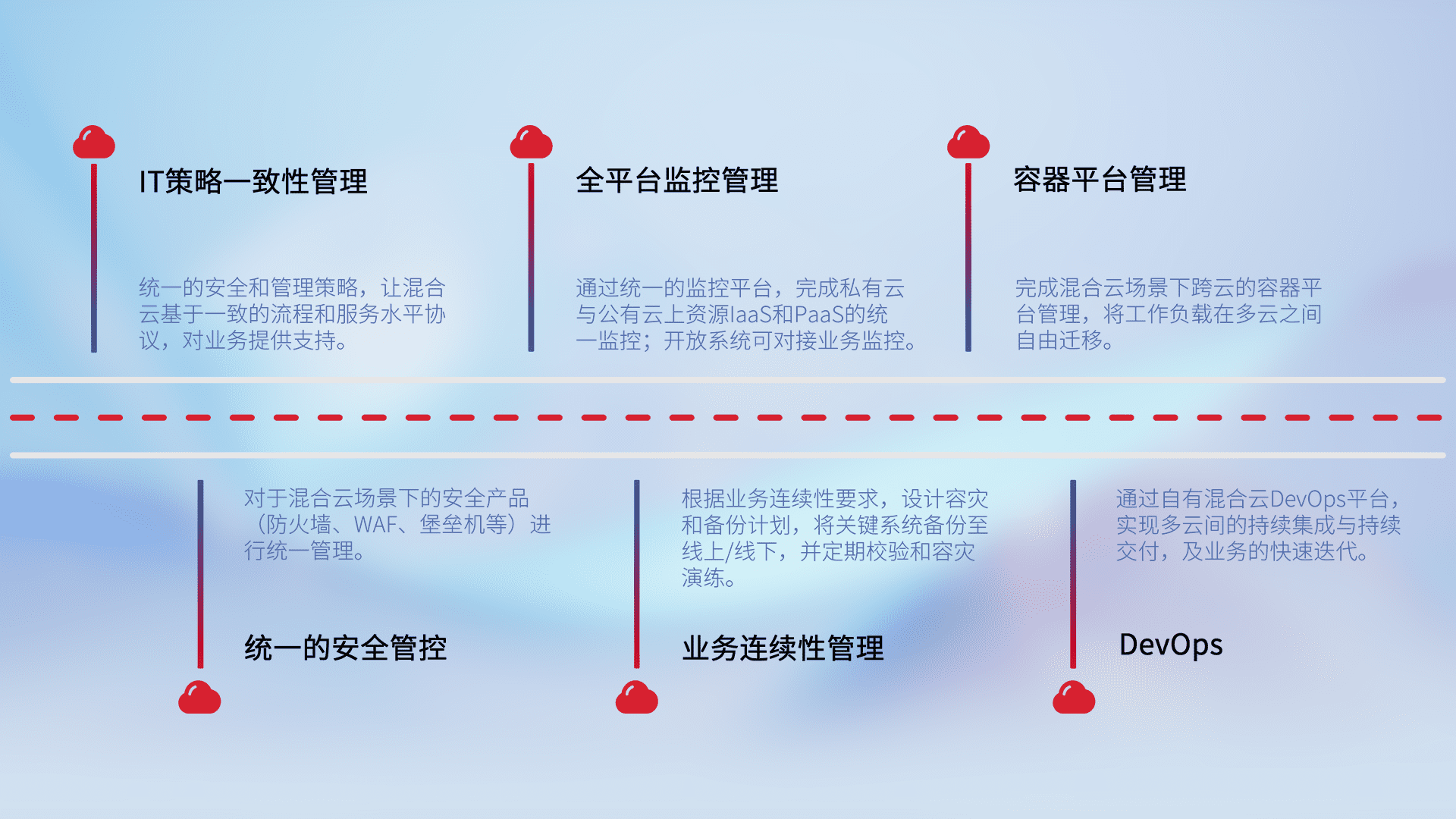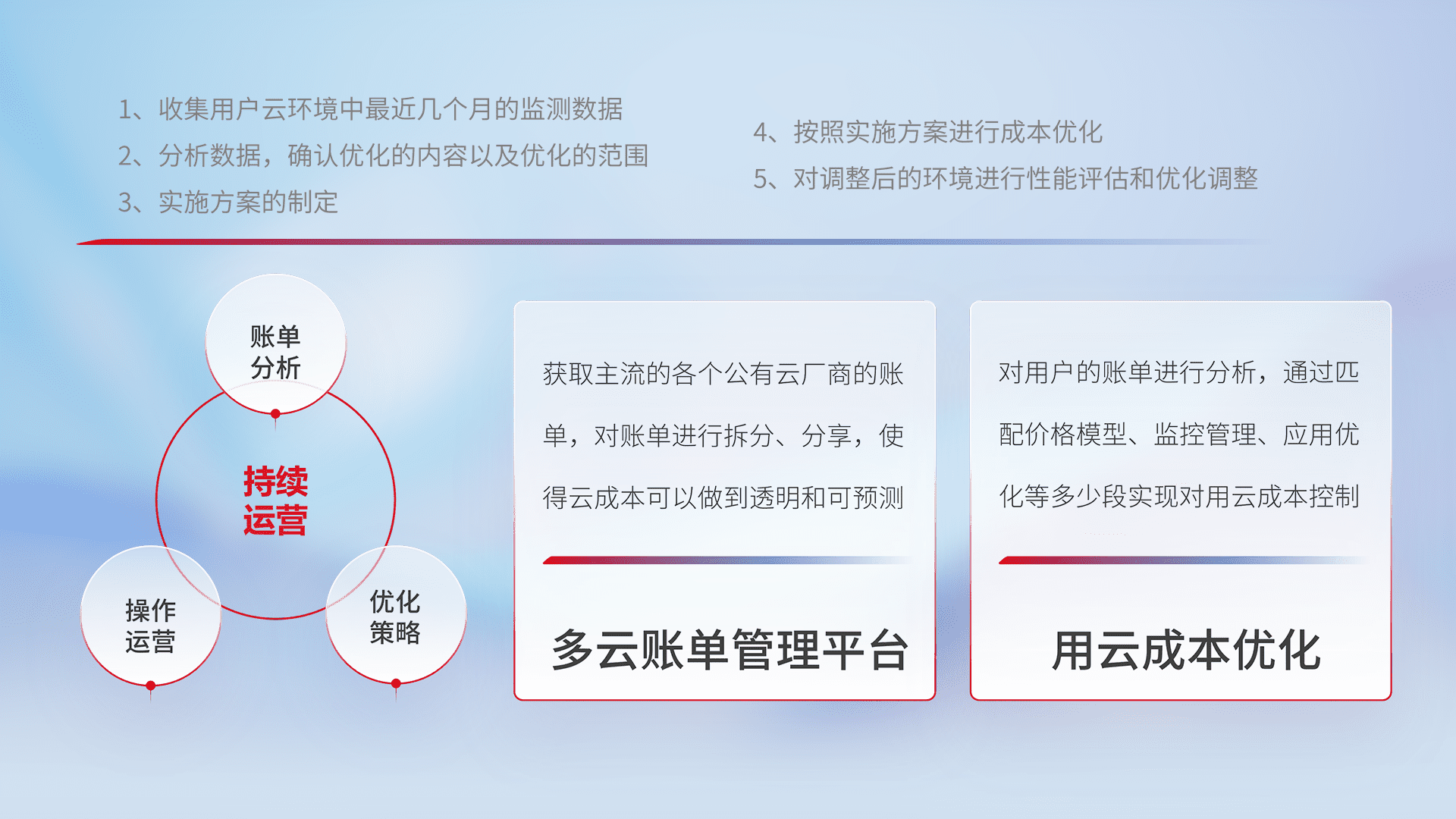 通过多云纳管,,以统一的资源数据模型把客户的云资源进行抽象和封装,,,进而实现对多云资源的统一操作,,保障云资源管理的可靠性、、、、稳定性与可用性。。量身定制化运维内容,,配置、、、、开发运维、、、补丁管理、、、备份、、、、监控、、认证和访问管理、、、审计和日常巡检等,,保障在用云过程中的可靠度,,稳定度以及高可用率。。。。