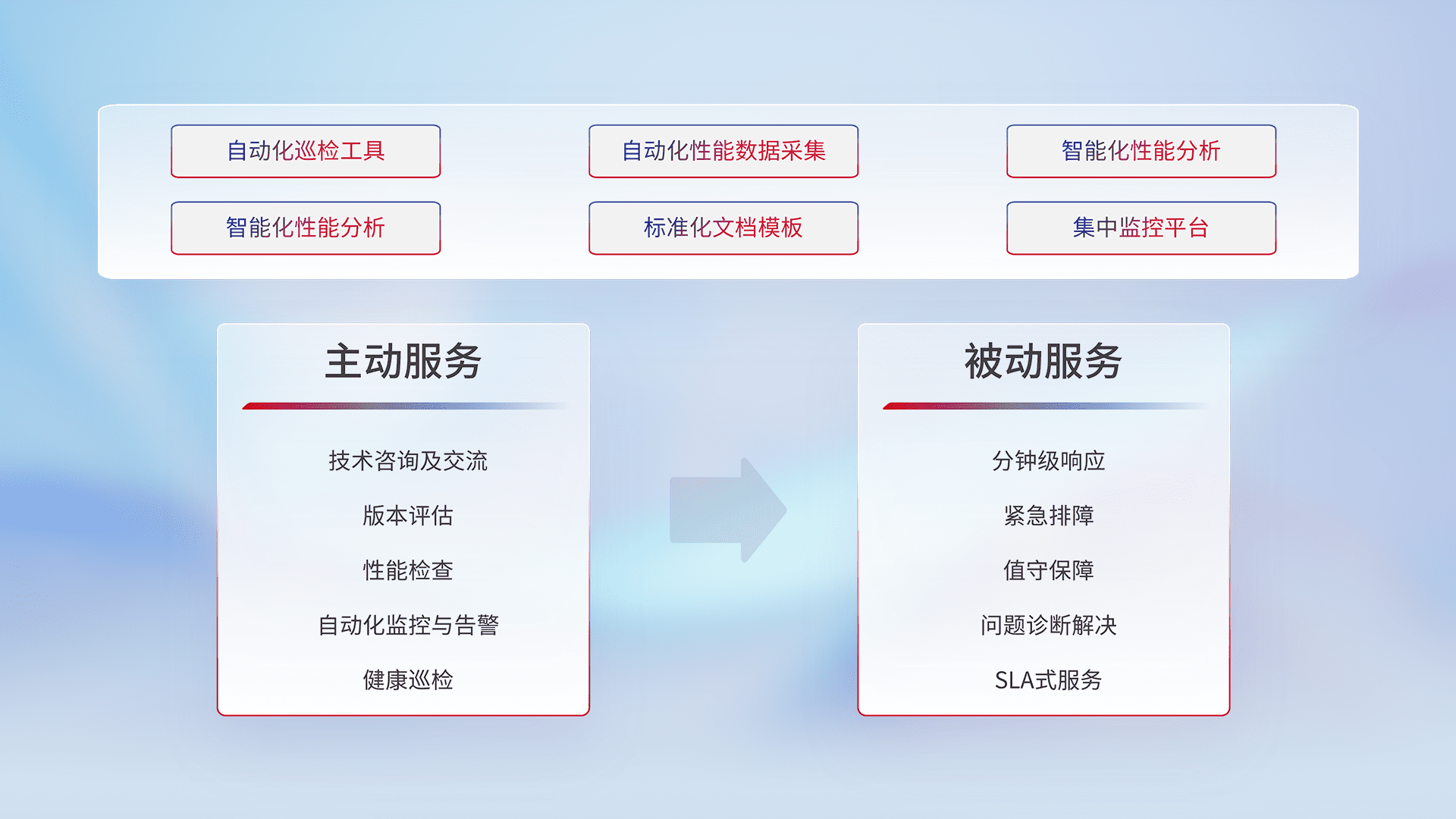 智能化工具和标准化文档,,,保障服务质量,,提供主动服务(包含技术咨询、、、版本评估、、性能检查、、、自动化监控与告警、、、健康巡检)和被动服务包含(分钟级响应、、紧急排障、、、值守保障、、、、问题诊断解决、、、、SLA服务)。。。。